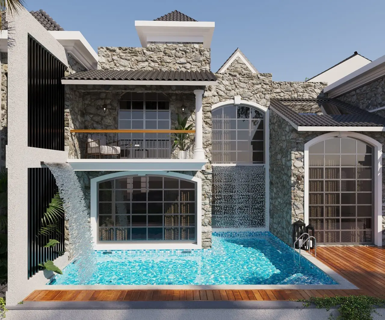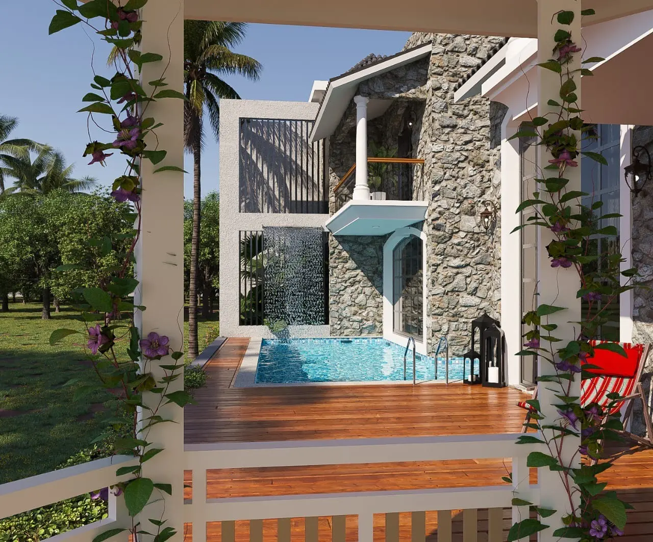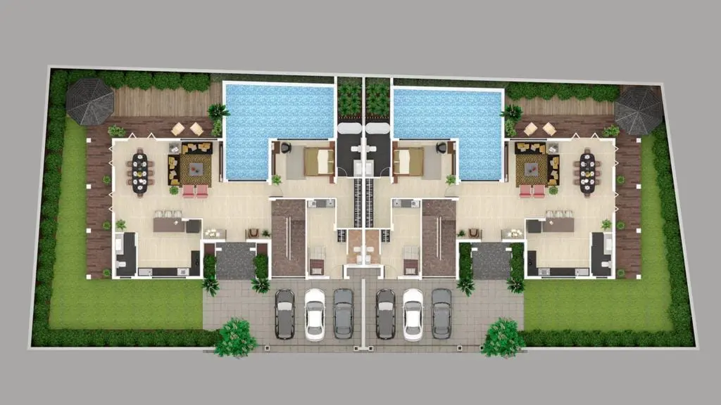 • 4 BHK Luxury Villa For Rent • Plot size : 495 Sqm • Total usable area : 445 Sqm • Built Up Area : 350 Sqm • Price: 2.5 Lac – Total 4 Bedroom with 5 Bathrooms including one powder room on Ground Floor. – All 4 Bathrooms Are Open To Sky With Greenery. – Servant quarter in each villa with small kitchen and toilet . – Individual Deck Area With Gazebo, Sit outs and a Big pool with a water fall from side.